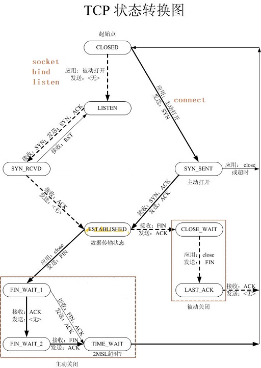 虚线表示服务器的正常状态转换,实线表示客户端的正常状态转换。对于同时打开和关闭的转换未标示。